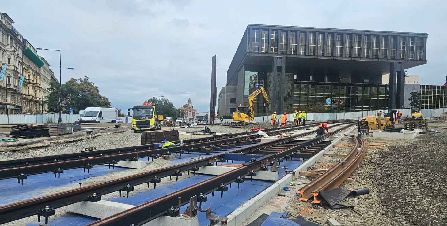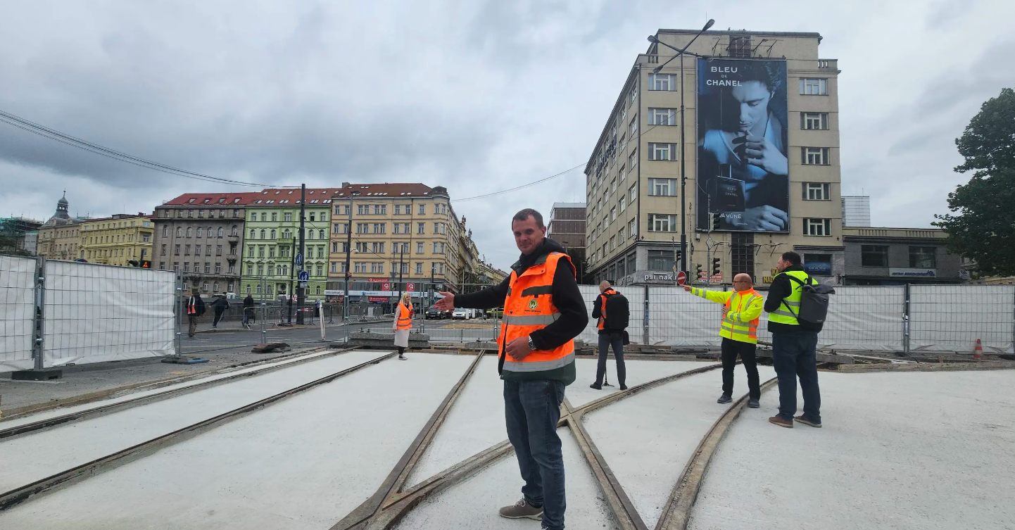 Примечательно, что именно по этим рельсам до конца года поедут… автомобили. Движение магистрали от центра в сторону главного вокзала и далее на Прагу 7 временно перенесут на новоустроенную часть рядом со старым зданием музея. Автомобили будут по-прежнему двигаться в двух полосах в обоих направлениях.