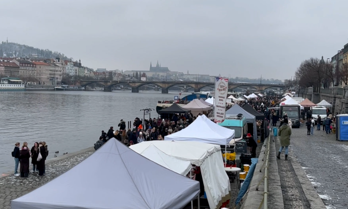 На пражской набережной у Вышеграда в субботу стартовал уже 17-й сезон крупнейших фермерских рынков столицы. Несмотря на холодную погоду, сюда с самого утра стекались толпы людей. Воздух наполняла знакомая и любимая смесь ароматов — свежемолотый кофе, жареные колбаски, знаменитые топинки с песто, а атмосферу дополняли мелодии из шарманки — от «Трёх ветеранов» до «Трёх орешков для Золушки».