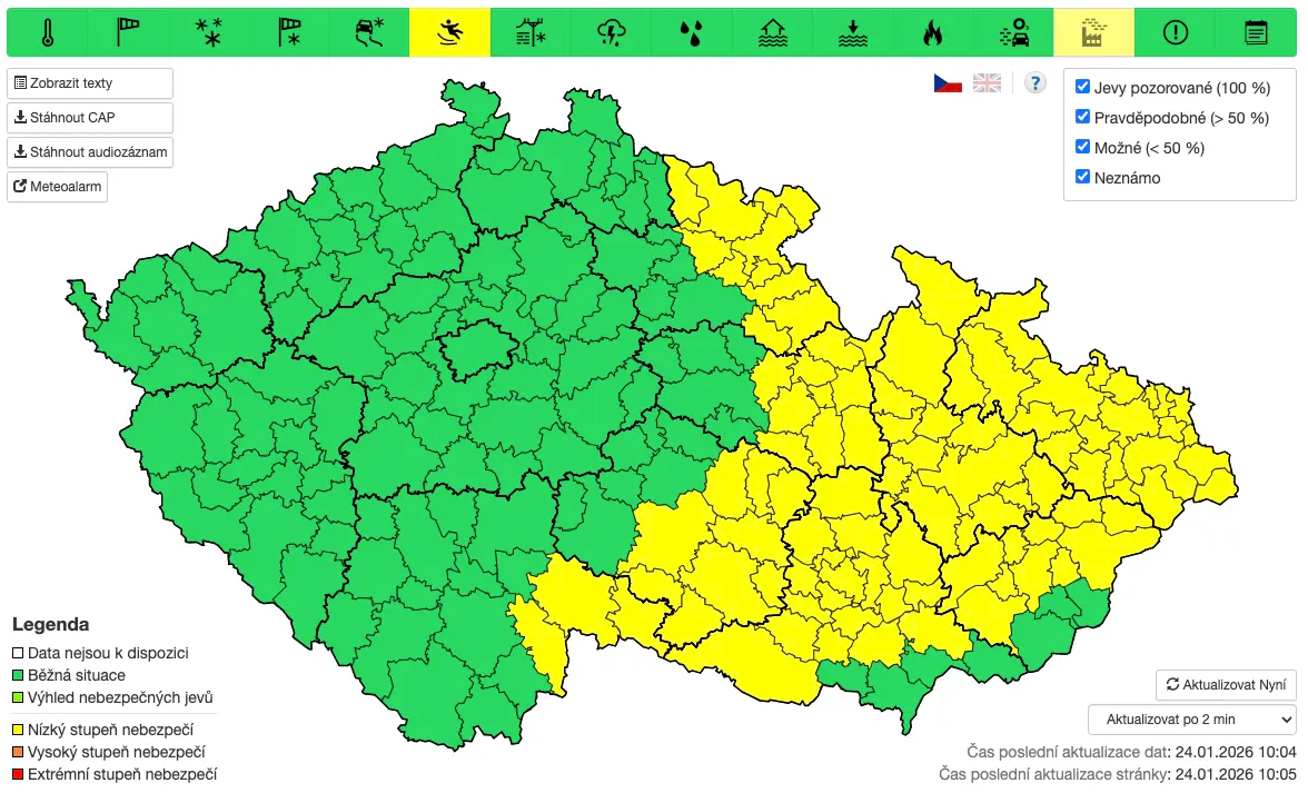 По данным метеорологов, на Моравии, в Силезии и на северо-востоке Чехии местами продолжается переохлаждённая морось, из-за которой на дорогах и тротуарах образуется ледяная корка. В ночные часы осадки в восточной части страны могут стать интенсивнее — ожидается дождь со снегом, а местами и замерзающий дождь, напрямую приводящий к образованию гололёда.