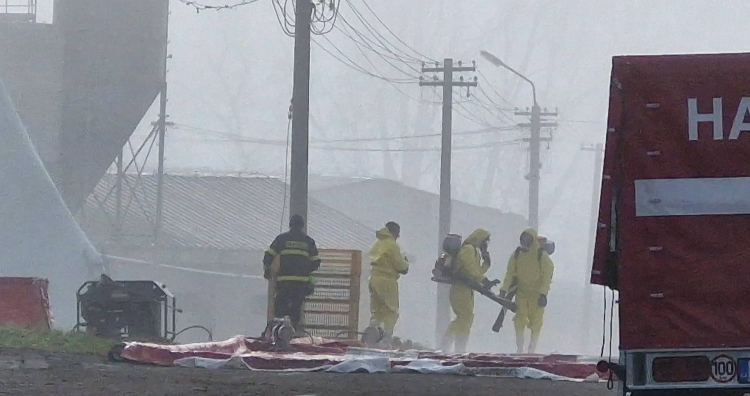 Внутрь ферм зашли три сотрудника хозяйства и одиннадцать пожарных в полных защитных костюмах, перчатках и респираторах. Они занимаются перемещением птицы и дезинфекцией людей и техники, участвующих в операции. Все работы займут целый день.