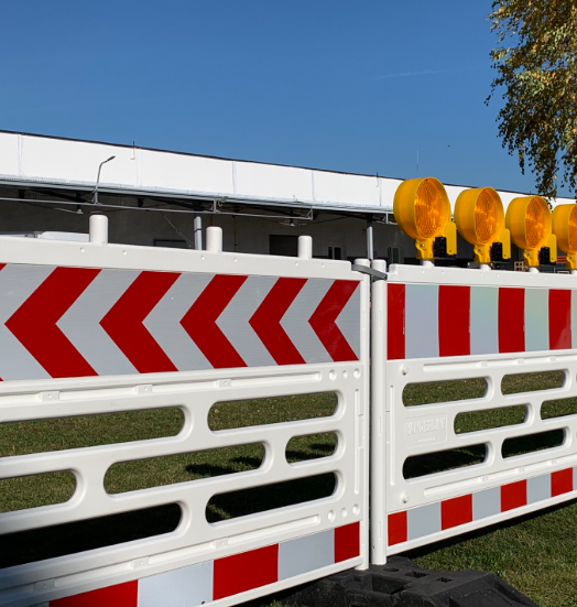 Барьеры заметно отличаются от привычных бетонных блоков. Они состоят из четырёх красных вертикальных стоек, соединённых жёлтыми горизонтальными трубами. Под каждой стойкой — ещё один серый элемент, направленный вниз и напоминающий перевёрнутую букву V.