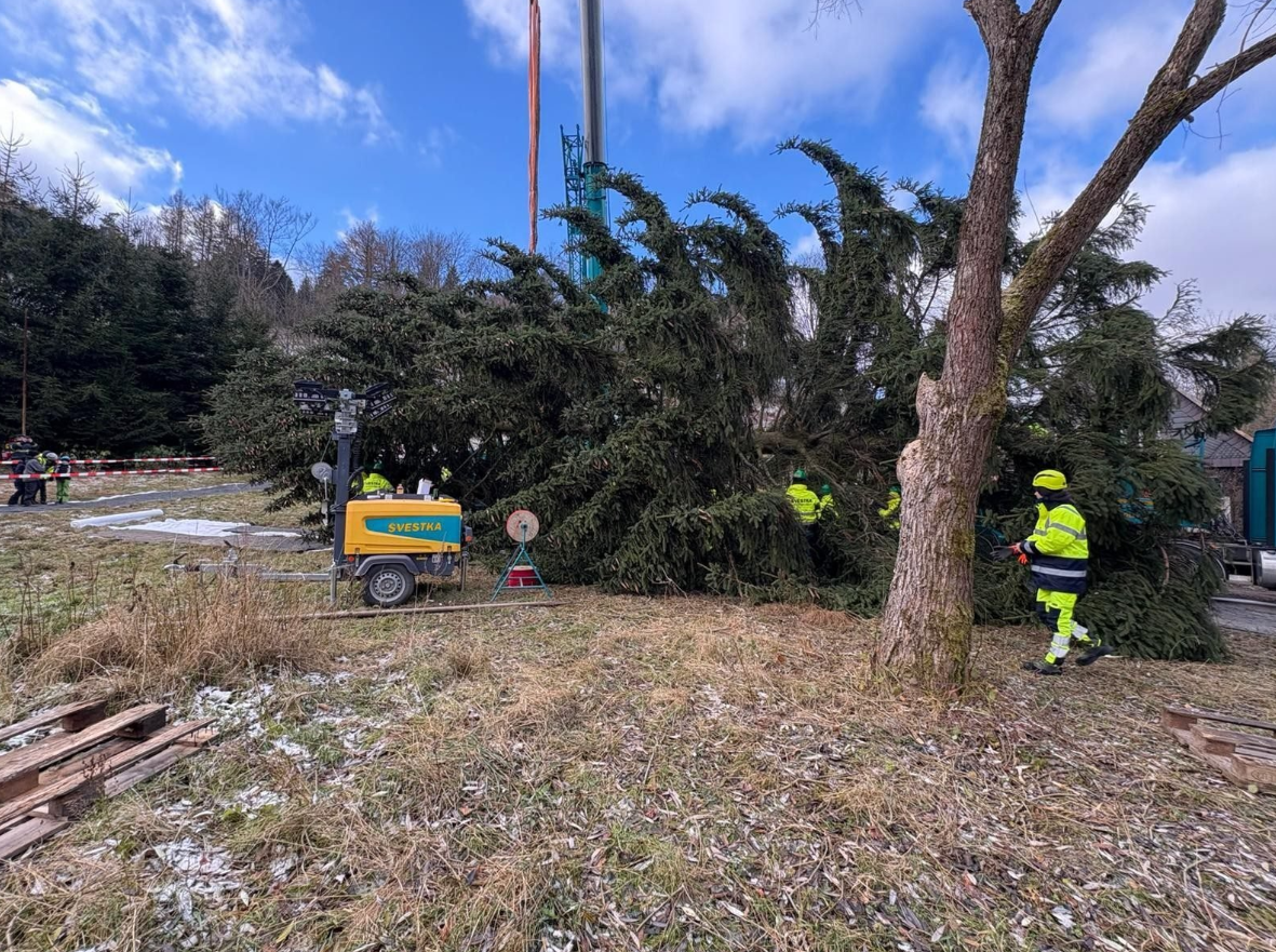 Работа началась с ювелирной точности. Прежде чем к стволу подошли дровосеки, на место прибыл мощный кран, который надёжно зафиксировал верхнюю часть гиганта — первоначальная высота ели составляла 26 метров. Только после этого рабочие включили бензопилы и осторожно отделили дерево от земли.