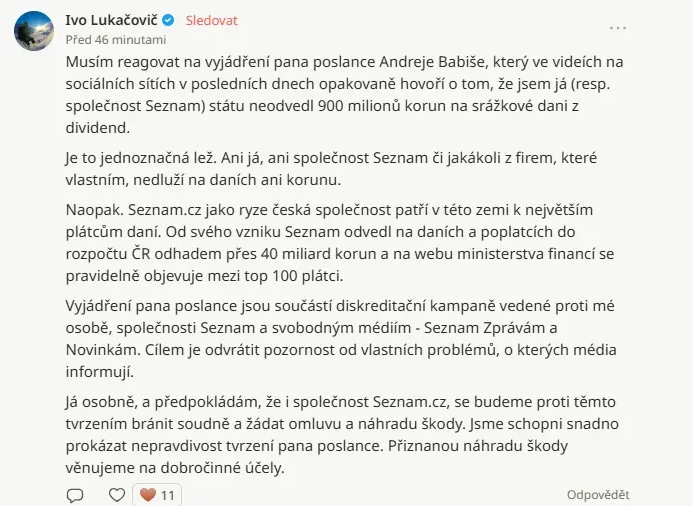 Владелец Seznam Иво Лукачович опроверг заявления председателя ANO Андрея Бабиша о том, что он и его компания якобы не уплатили государству 900 миллионов чешских крон налогов с дивидендов. Лукачович назвал эти утверждения «однозначной ложью» и сообщил, что будет защищать свою репутацию в суде, требовать публичного извинения и возмещения ущерба, которое планирует передать на благотворительность.