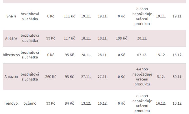 В ноябре редакция заказала товары из чешских интернет-магазинов Alza, Notino, Datart и TS Bohemia, а также с таких международных площадок, как китайские Temu, Shein, AliExpress, американский Amazon, турецко-китайский Trendyol и польский Allegro.
