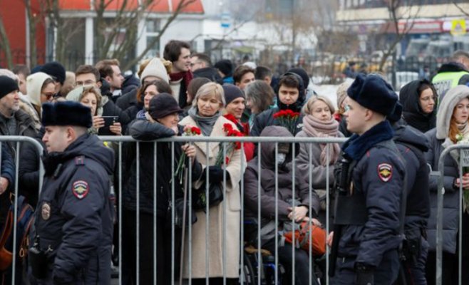На видеозаписях из Москвы видно, что во время церемонии отпевания Алексея Навального в храме Иконы Божьей Матери тысячи россиян под охраной полиции скандировали "Нет войне!", а также имя покойного и лозунг "Путин - убийца".