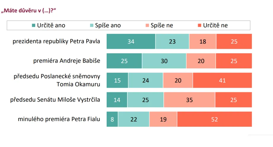 Президенту Петру Павлу доверяют 57 % граждан — это почти три пятых общества. Премьер-министру Андрею Бабишу доверяют 55 % опрошенных. Оба показателя означают, что более половины населения выражает доверие высшим представителям власти, что считается сильным результатом.